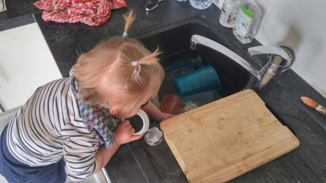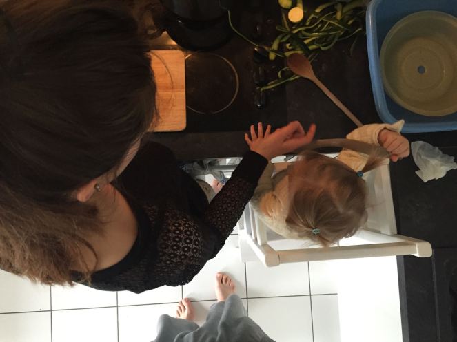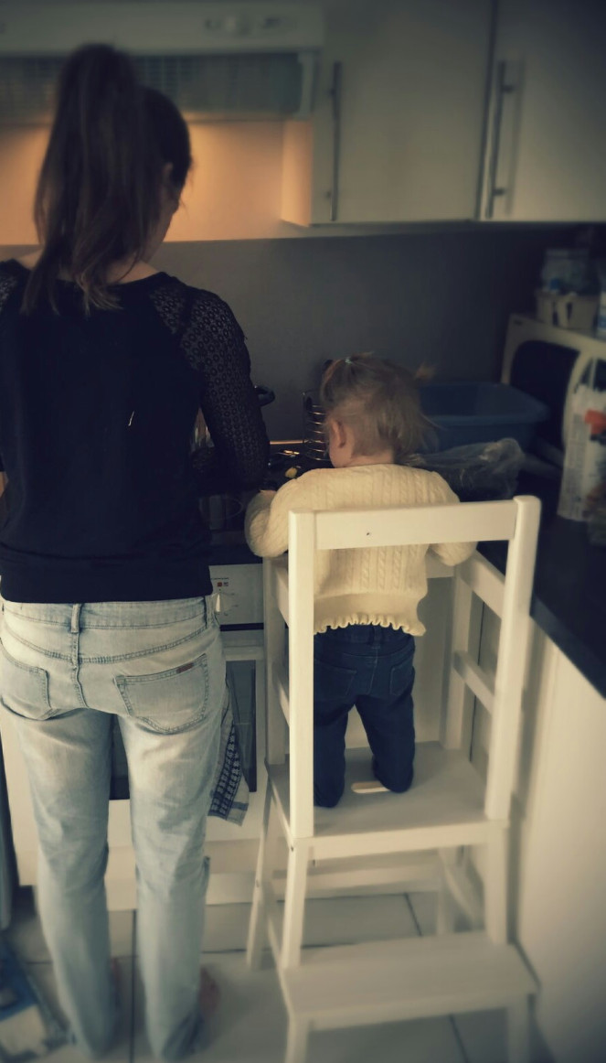 Dès qu’elle est à mes côtés, je fais bien sûr très attention : je la mets sur le plan de travail et je me mets face aux feux, je prends bien garde à reposer mes couteaux hors de sa portée à chaque fois, etc. On a encore cuisiné ensemble hier soir, et c’était un vrai plaisir : elle patouillait dans un bol avec un peau d’eau, des pâtes et des ustensiles en plastique. Je lui parle également de ce que je fais, des légumes que je coupe, des pâtes qui doivent cuire pour être mangées… Je la laisse touiller les préparations, manger (et recracher) les légumes crus et les épluchures, je lui fais sentir la vapeur chaude quand on égoutte les pâtes… Je peux vraiment la laisser en autonomie car je sais qu’elle est en sécurité, pas comme si je l’avais fait monter sur une chaise. Evidemment, ça me prend un peu plus de temps que si je cuisinais tranquille toute seule. Mais comme ce n’est pas une option proposée, c’est mille fois plus agréables ainsi qu’avec un bébé qui chouine dans ses jambes. Et elle est tellement fière !