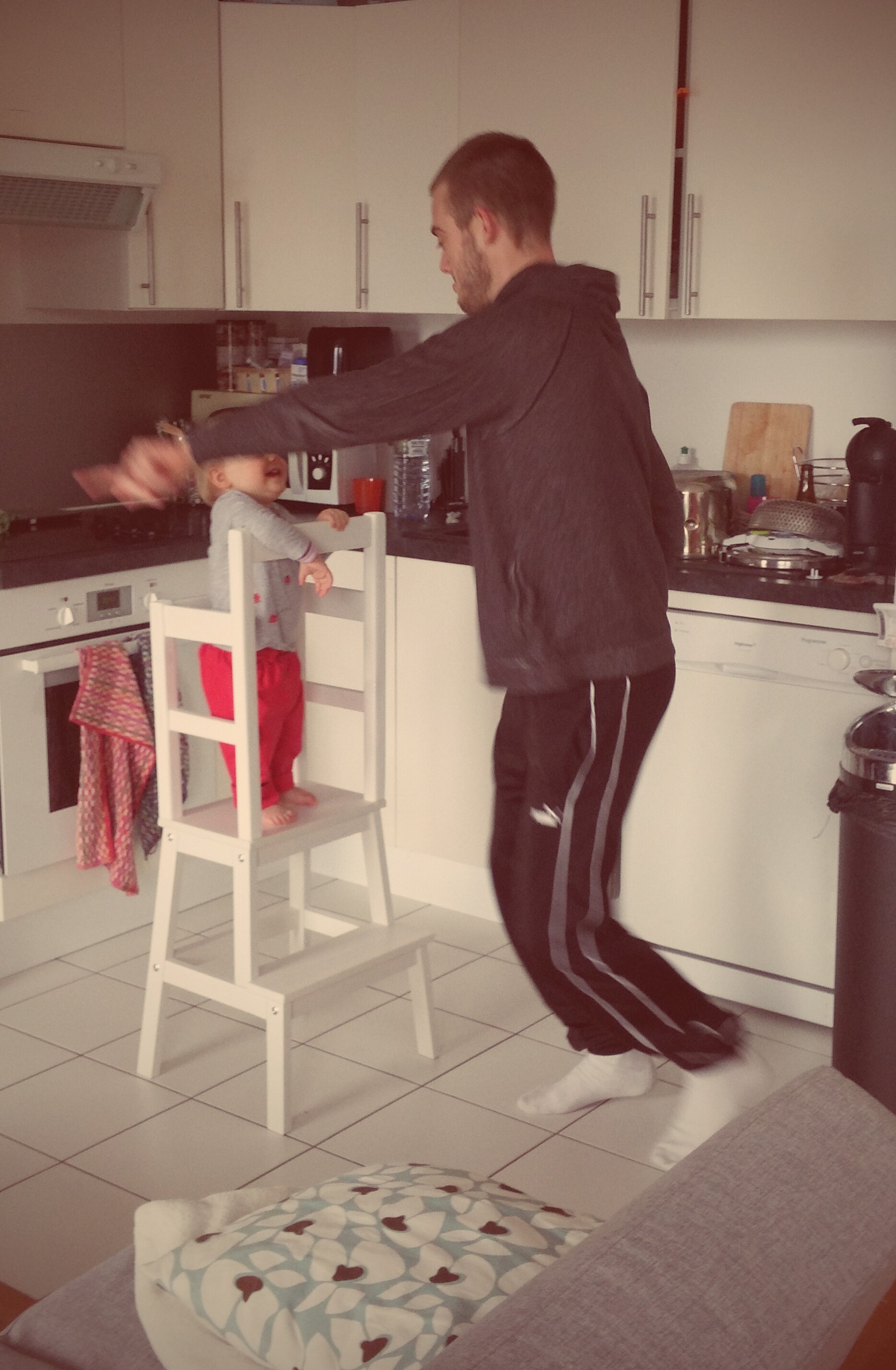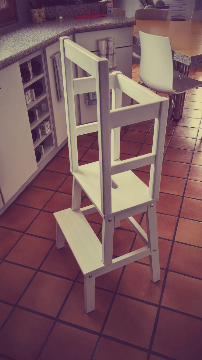 L’idée, c’est (encore et toujours) de favoriser l’autonomie de l’enfant, en lui créant une tour qui va lui permettre d’accéder et d’observer à ce qui se trouve en hauteur, en particulier le plan de travail de la cuisine. Il peut ainsi participer à la préparation des repas, attraper sa petite vaisselle, se laver les mains dans l’évier, etc.