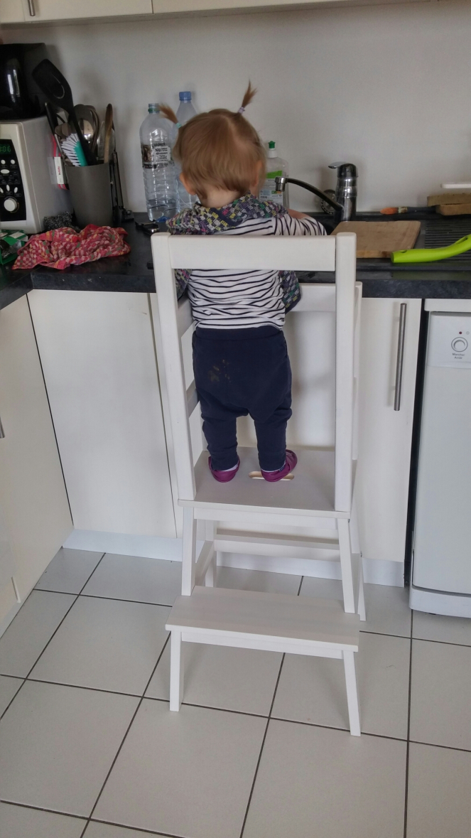 Pour ce qui est de l’utilisation, elle nous sert énormément lorsque je cuisine. Dans ces moments là, Bébé Carrousel a tendance à s’agripper à mes jambes, à me tirer sur le pantalon, à chouiner pour que je la prenne et qu’elle voit ce qui se passe (ce qui n’est pas du tout enervant quand tu as les mains dans la sauce tomate). Maintenant, elle va d’elle-même dans sa chambre pour chercher sa tour (et revient en chouinant pour qu’on vienne l’aider, car avec la moquette elle n’y arrive pas, c’est quand même assez lourd !), grimpe à côté de moi et on ne l’entend plus (sauf quand elle goûte une épluchure d’aubergine et trouve ça degueu). Bref, elle a compris que grâce à sa tour elle peut obtenir ce qu’elle veut ; un siège au premier rang sur maman qui cuisine !