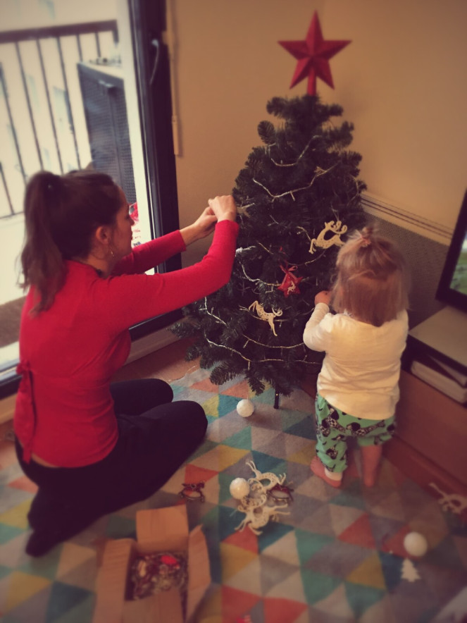 Choisir chaque année une ou deux boules supplémentaires pour le sapin (c’est Bébé Carrousel qui a choisi cette année) et le décorer le 1er week-end de décembre, bien au chaud chez soi quand il fait froid dehors, en sirotant un petit thé (et en empêchant bébé Carrousel d’avaler les agrafes !) avec un téléfilm de noël à la con en fond sonore.