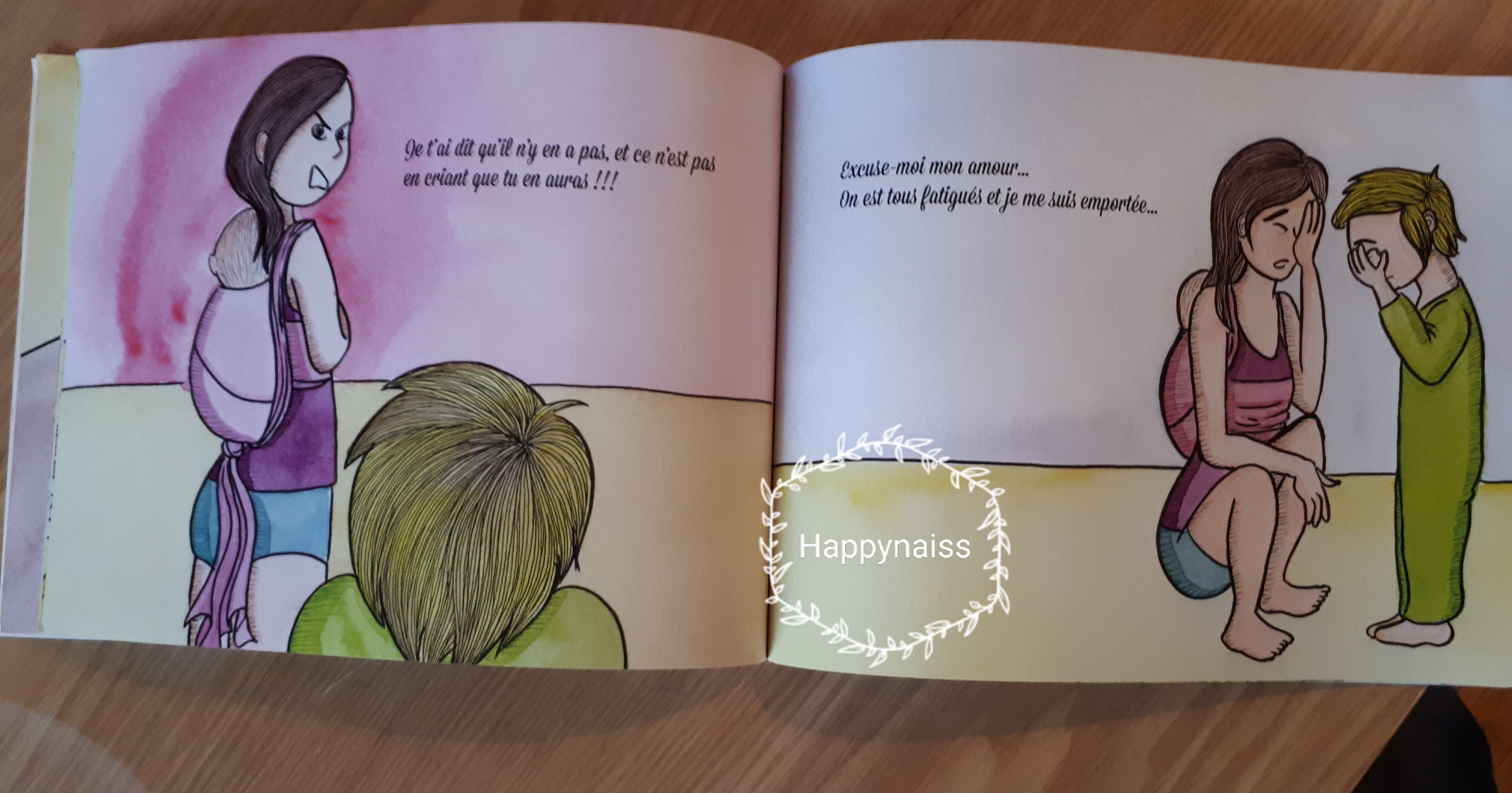 Ma Carrousel a tout de suite accroché car elle s’est bien retrouvée dans les situations : l’ainé qui réveille le bébé en journée et le bébé qui réveille l’ainé la nuit, les parents qui s’excusent d’avoir crié, le bébé constamment au sein de sa mère ou en écharpe… d’ailleurs ma Carrousel m’a regardée l’oeil brillant et un grand sourire aux levres a sa premiere lecture, genre « mais t’as vu on dirait exactement nous? »..