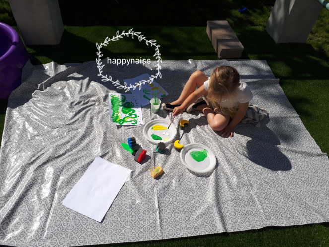 Pendant la sieste matinale de la Fusée (qu’elle fait, OMG, dans SON LIT, depuis environ 10 jours…. 30 minutes pour l’endormir et pouvoir la poser, 22 minutes de dodo, l’arnaque du siècle, mais passons!), je me dépêche de sortir une vieille nappe sur la terrasse, des feuilles, des pinceaux, des éponges, de l’eau et de proposer à ma Carrousel une petite séance de peinture aux couleurs de printemps. Je propose à la Carrousel qu’on finisse par de la peinture avec nos mains, elle s’étale copieusement du vert sur la paume (et l’avant bras, le coude, la cuisse et le genoux …) puis… « maiiiiis j’en ai partout, j’aime pas, je veux me laver les mains ! « . -_- Après 8 minutes d’activité peinture, nous passons 12 minutes d’activité « se frotter les mains avec du scotch-britch puis récurer les éclaboussures sur l’évier » et la Fusée est réveillée.
